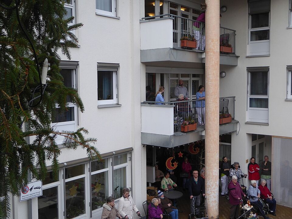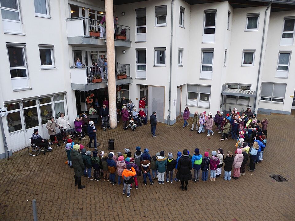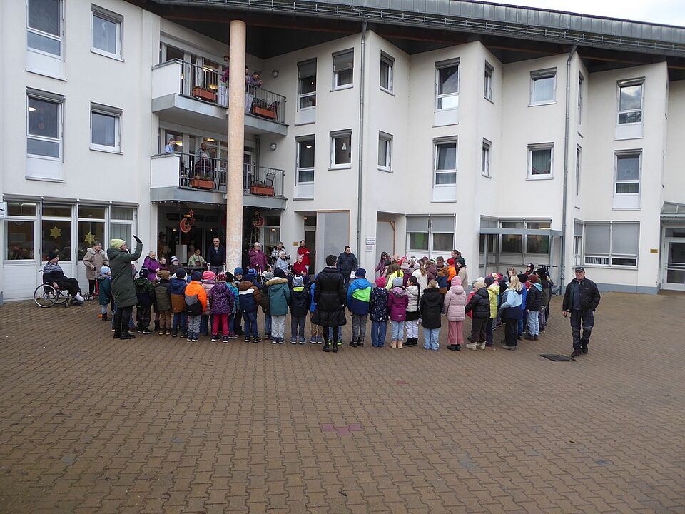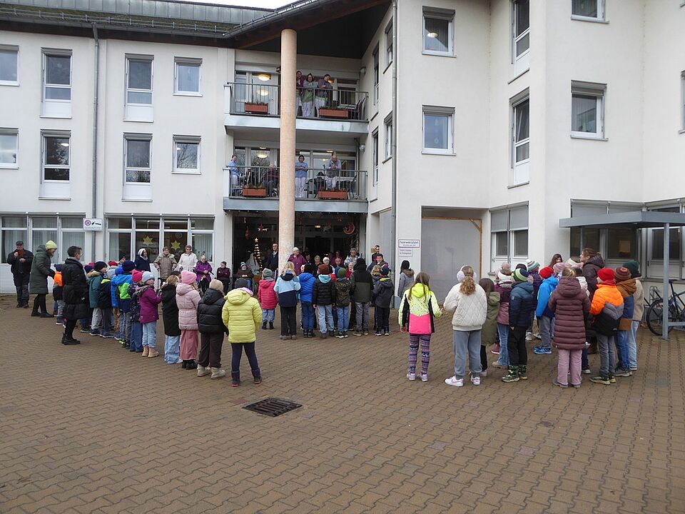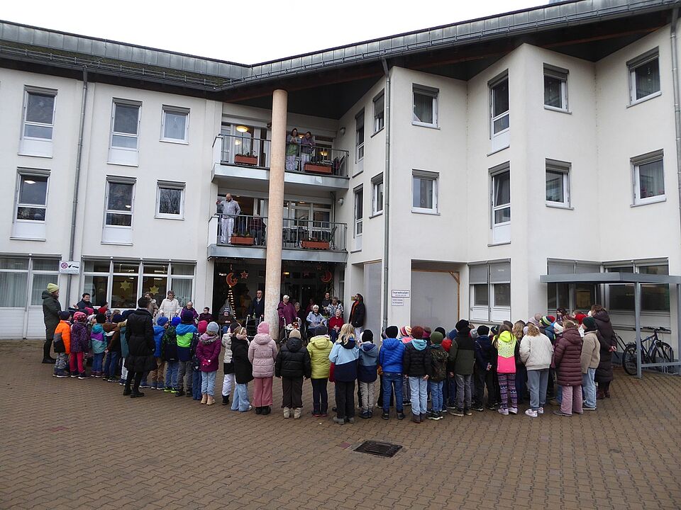 Schon im letzten Jahr überraschten uns die Grundschüler der Schule Ludwigsstadt in der Adventszeit mit einem spontanen Besuch. Auch in diesem Jahr kamen alle Klassen, über 80 Schülerinnen und Schüler, mit der Schulleiterin, Frau Hermann, Musiklehrer Herrn Rentsch, und weiteren Lehrkräften und Elternvertretern, zu einem Überraschungsbesuch. Und sie haben ein buntes Programm an Liedern und Vorträgen mitgebracht. Frau Herrmann erzählte eine lustige Geschichte über eine Christbaumspitze, die abgebrochen war und nun irgendwie wieder repariert werden musste. Mit dem Abschlusslied “Felice Navidad” zeigten die Kinder wie fröhlich die frohe Weihnacht sein kann: der südamerikanische Rhythmus regte die Kinderschaar zum Schunkeln und Tanzen ein und zauberte damit ein Lächeln auf die Gesichter der Bewohner. Zum Abschluss übergaben die Kinder noch selbstgebastelte Geschenke, die dann zum Heiligen Abend verteilt werden. Tolle Überraschung!