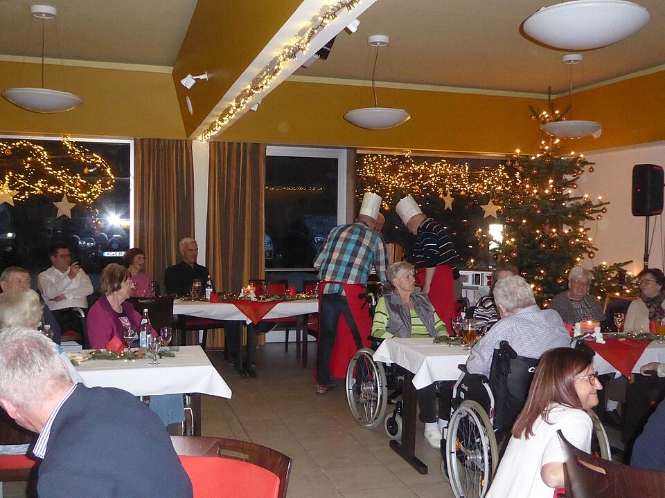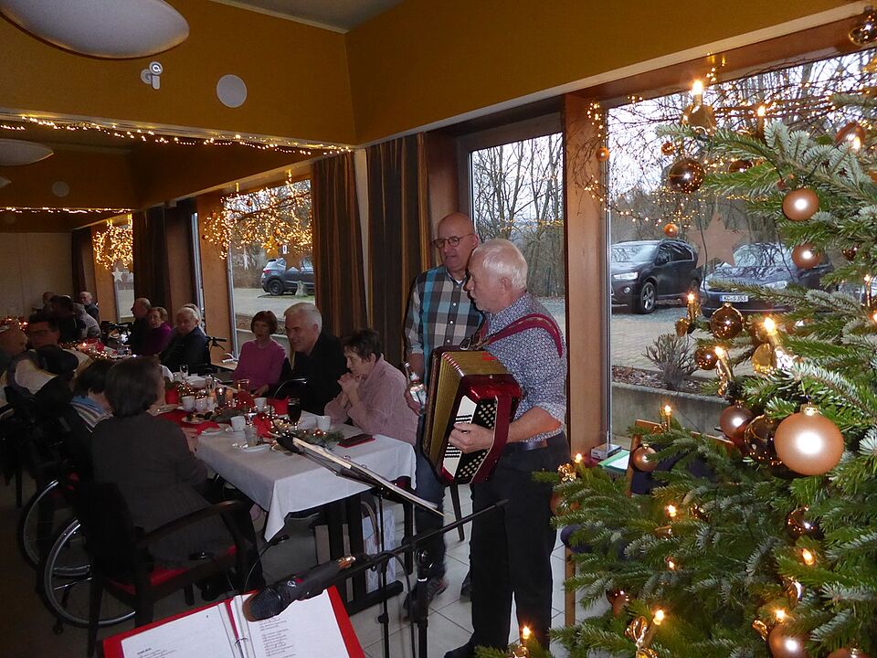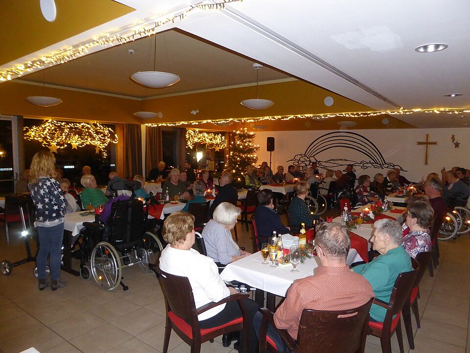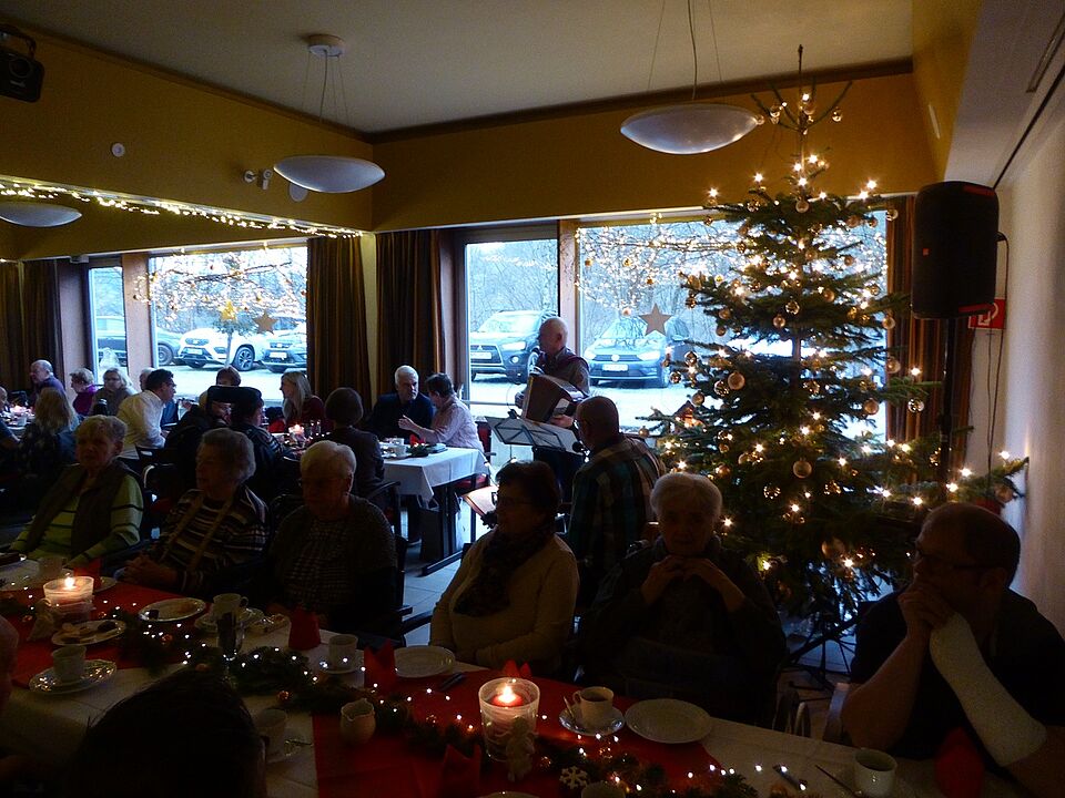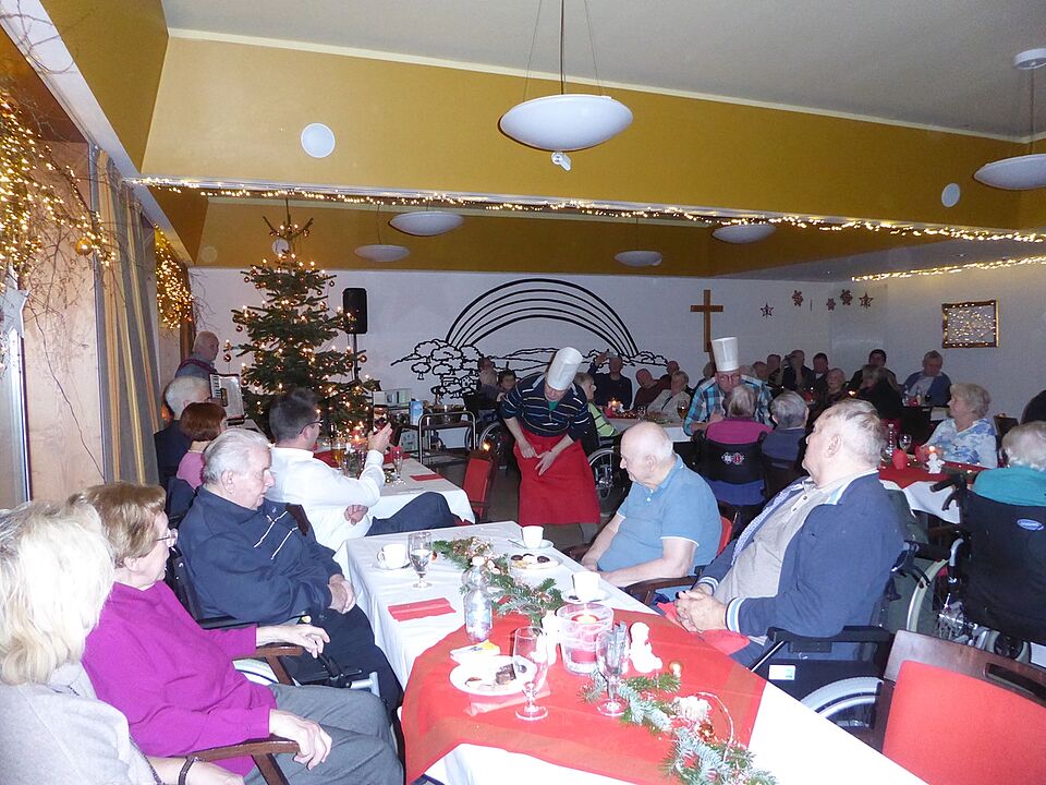 Die Bewohnerweihnacht ist jedes Jahr das schönste Fest im Jahreskreis, zu dem auch immer alle Angehörigen eingeladen sind, so dass eine sehr familiäre Atmosphäre entsteht. Für die weihnachtliche Musikumrahmung sorgten unser Haus- und Hofmusiker, Reinhardt Ziener (Akkordeon) und Hausmeister Enrico Wäcker (Gitarre). Auch Ehrengäste wohnten unserer Bewohnerweihnacht bei. Vom BRK Kreisverband kamen aus der Vorstanschaft Frau Dr. Heidi Beyerle und Annette Schneider, sowie der stellvertretende Geschäftsführer, Ralf Schmidt. Auch der Ludwigsstädter Bürgermeister, Timo Ehrhardt, beehrte unser Fest und trug eine weihnachtliche Geschichte vor. Überraschend kam dann auch noch der Nikolaus an den Fenstern des Festsaales vorbeigeschlichen und schließlich auch hinein in den Saal, um allen Anwesenden eine frohe Weihnacht zu wünschen. Die Betreuungskräfte begaben sich in die Rolle der vier Adventskerzen und erzählten besinnliche Geschichten zur Weihnachtszeit. Natürlich durfte auch die “Weihnachtsbäckerei” nicht fehlen. Hausmeister und Heimleiter standen am (Spiel)Herd, um zu den Klängen von Rolf Zuckowski ihre Backkünste unter Beweis zu stellen. Auch kulinarisch war die Feier ein Höhepunkt, denn es gab einen wahren Festschmaus, Gänsebrust mit Blaukraut und Klößen, und zum Nachtisch ein Mousse-au-Chocolat-Törtchen auf Fruchtspiegel. Zum Abschluss sangen alle Bewohner und Gäste noch gemeinsam die traditionellen Weihnachtslieder “Stille Nacht, heilige Nacht" und “oh, du fröhliche”. Eine rundum würdevolle Feier!