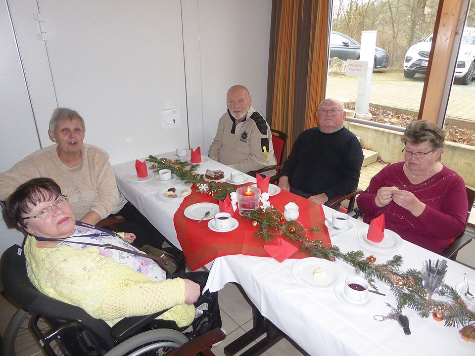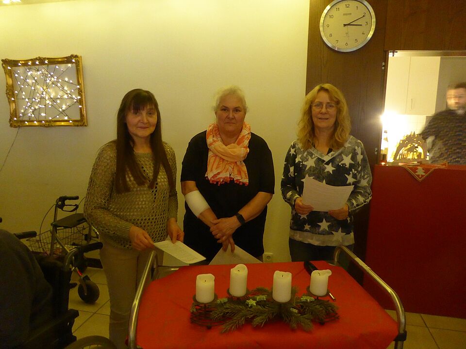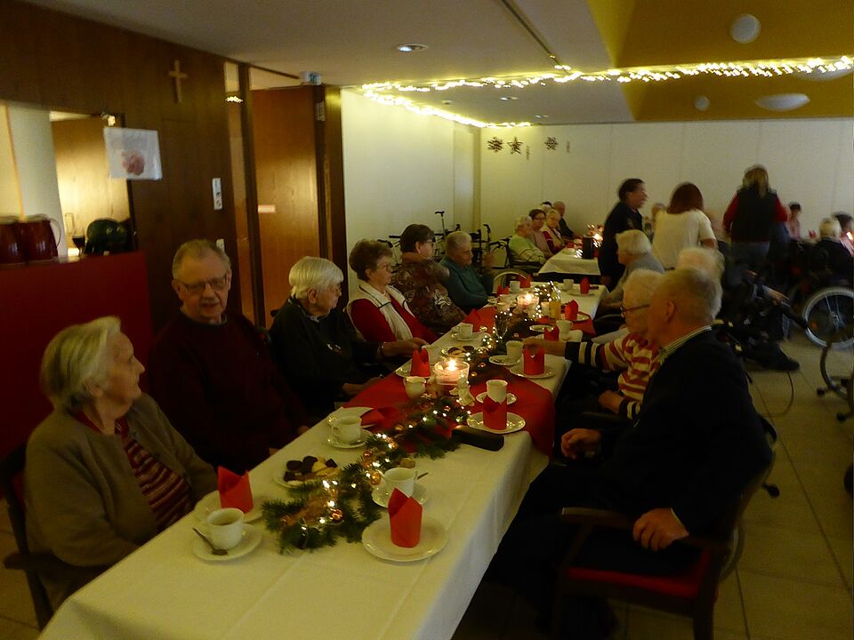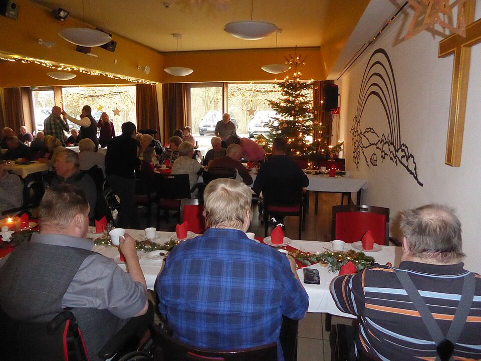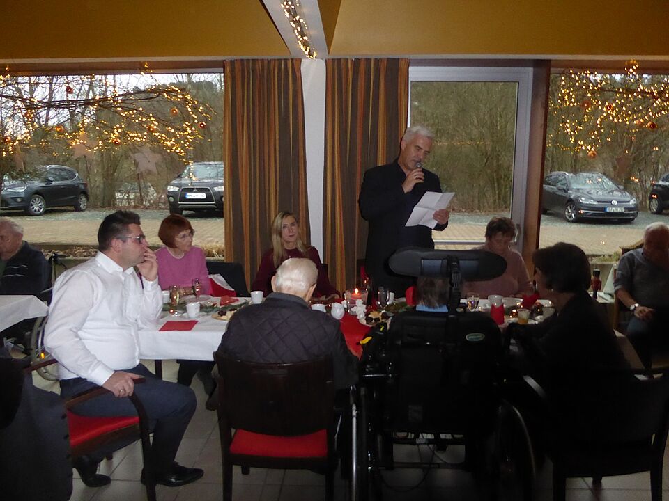 Die Bewohnerweihnacht ist jedes Jahr das schönste Fest im Jahreskreis, zu dem auch immer alle Angehörigen eingeladen sind, so dass eine sehr familiäre Atmosphäre entsteht. Für die weihnachtliche Musikumrahmung sorgten unser Haus- und Hofmusiker, Reinhardt Ziener (Akkordeon) und Hausmeister Enrico Wäcker (Gitarre). Auch Ehrengäste wohnten unserer Bewohnerweihnacht bei. Vom BRK Kreisverband kamen aus der Vorstanschaft Frau Dr. Heidi Beyerle und Annette Schneider, sowie der stellvertretende Geschäftsführer, Ralf Schmidt. Auch der Ludwigsstädter Bürgermeister, Timo Ehrhardt, beehrte unser Fest und trug eine weihnachtliche Geschichte vor. Überraschend kam dann auch noch der Nikolaus an den Fenstern des Festsaales vorbeigeschlichen und schließlich auch hinein in den Saal, um allen Anwesenden eine frohe Weihnacht zu wünschen. Die Betreuungskräfte begaben sich in die Rolle der vier Adventskerzen und erzählten besinnliche Geschichten zur Weihnachtszeit. Natürlich durfte auch die “Weihnachtsbäckerei” nicht fehlen. Hausmeister und Heimleiter standen am (Spiel)Herd, um zu den Klängen von Rolf Zuckowski ihre Backkünste unter Beweis zu stellen. Auch kulinarisch war die Feier ein Höhepunkt, denn es gab einen wahren Festschmaus, Gänsebrust mit Blaukraut und Klößen, und zum Nachtisch ein Mousse-au-Chocolat-Törtchen auf Fruchtspiegel. Zum Abschluss sangen alle Bewohner und Gäste noch gemeinsam die traditionellen Weihnachtslieder “Stille Nacht, heilige Nacht" und “oh, du fröhliche”. Eine rundum würdevolle Feier!