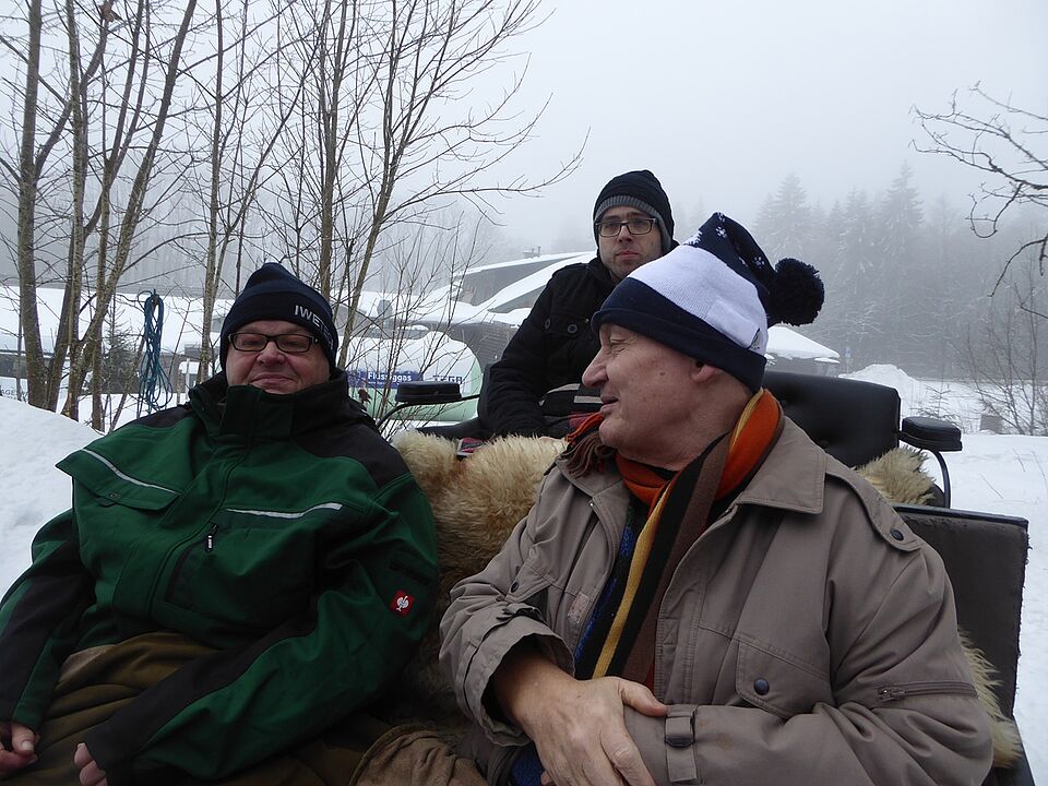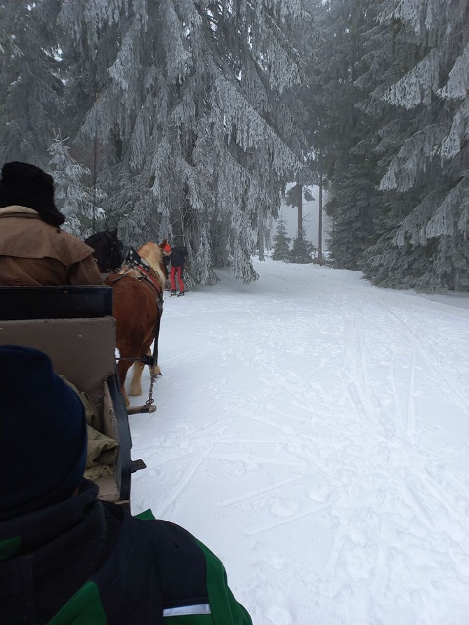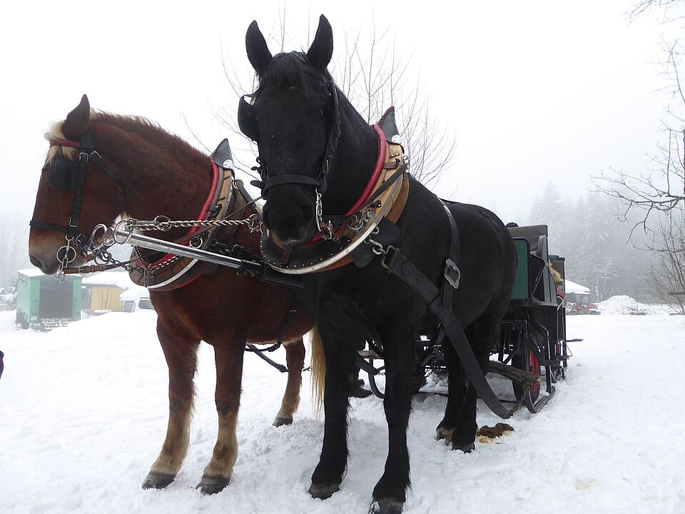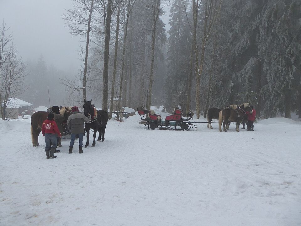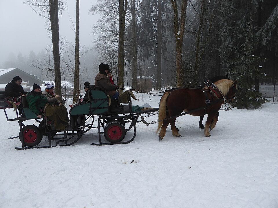 Seit Jahren konnten wir wieder einmal unseren altbewährten Winterausflug machen: eine Pferdeschlittenfahrt mit dem Reiterhof Kirchner in Neuhaus am Rennweg. Das Wetter passte, es lag genug Schnee und die tiefhängenden Nebelschwaden und gefrorenen Tannenspitzen ließen die Fahrt wie in einem Märchenwald wirken.