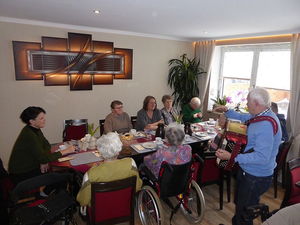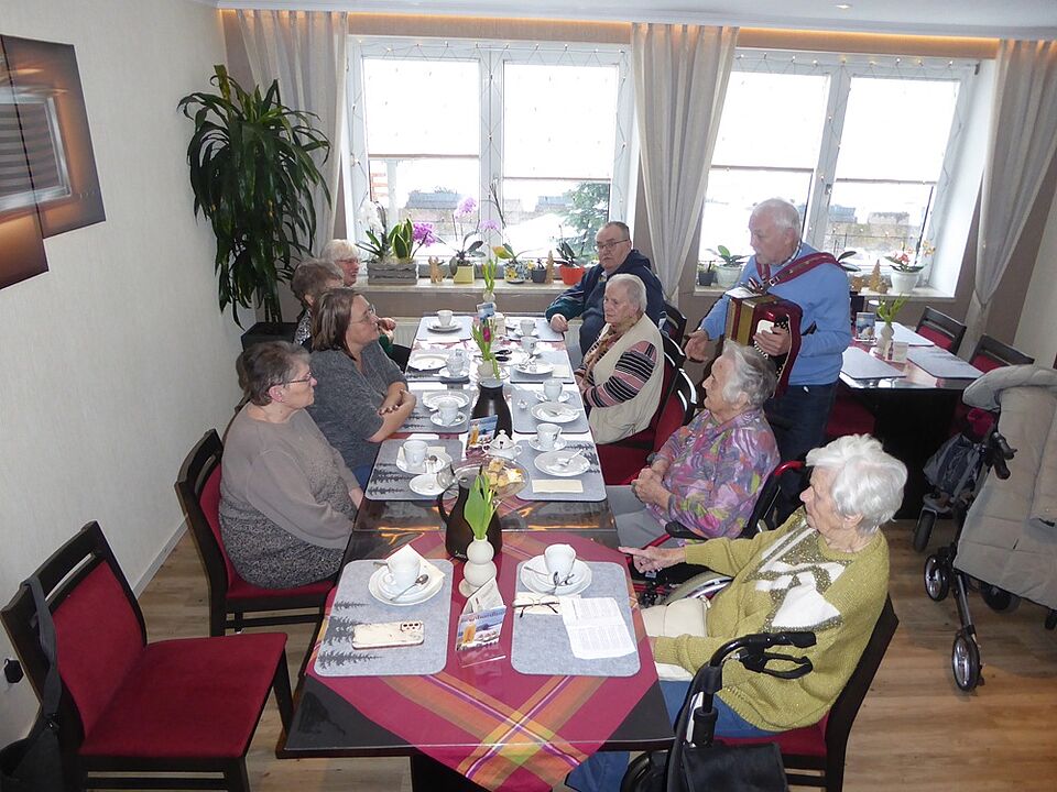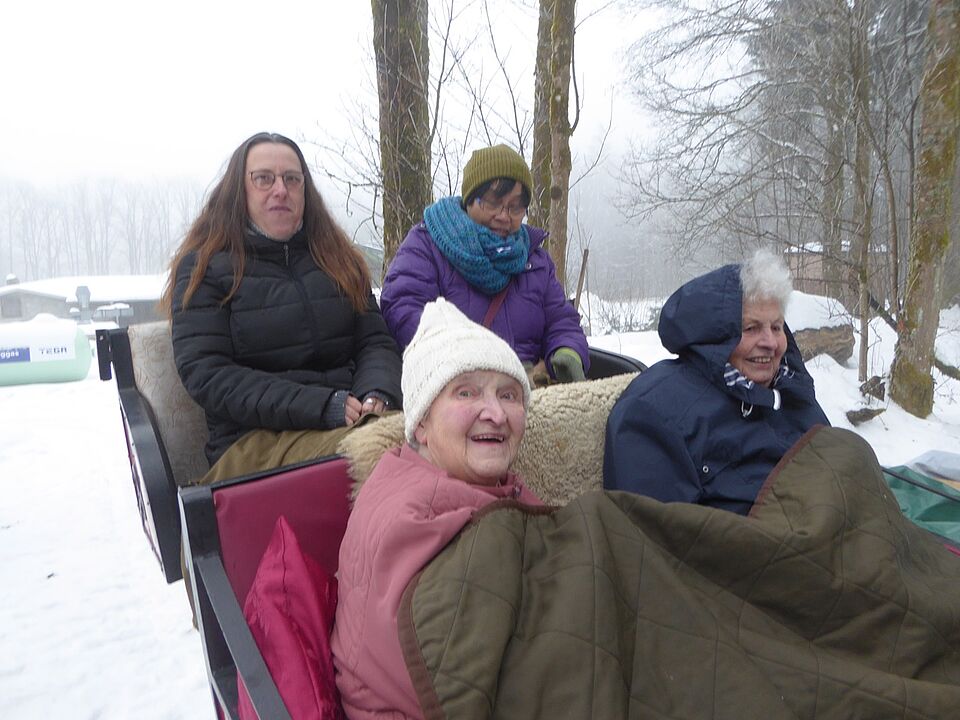 Während eine Gruppe schlitten fuhr, kehrte die andere Gruppe im Café Oberland ein, um sich für die Pferdeschlittenfahrt bei Kaffee und Kuchen vorzubereiten. Für Stimmung sorgte unser Haus- und Hofmusikant, Reinhard Ziener mit seinem Akkordeon. Natürlich blieb die erste Gruppe nicht unversorgt, so wurde nach der Hälfte der Schlittenfahrt eine Pause gemacht und Glühwein und Tee ausgeschenkt. Nach erledigter Pause ging es wieder mit leeren Glühweinflaschen und vollen Teekannen zurück. Alles in allem ein gelungener Ausflug.