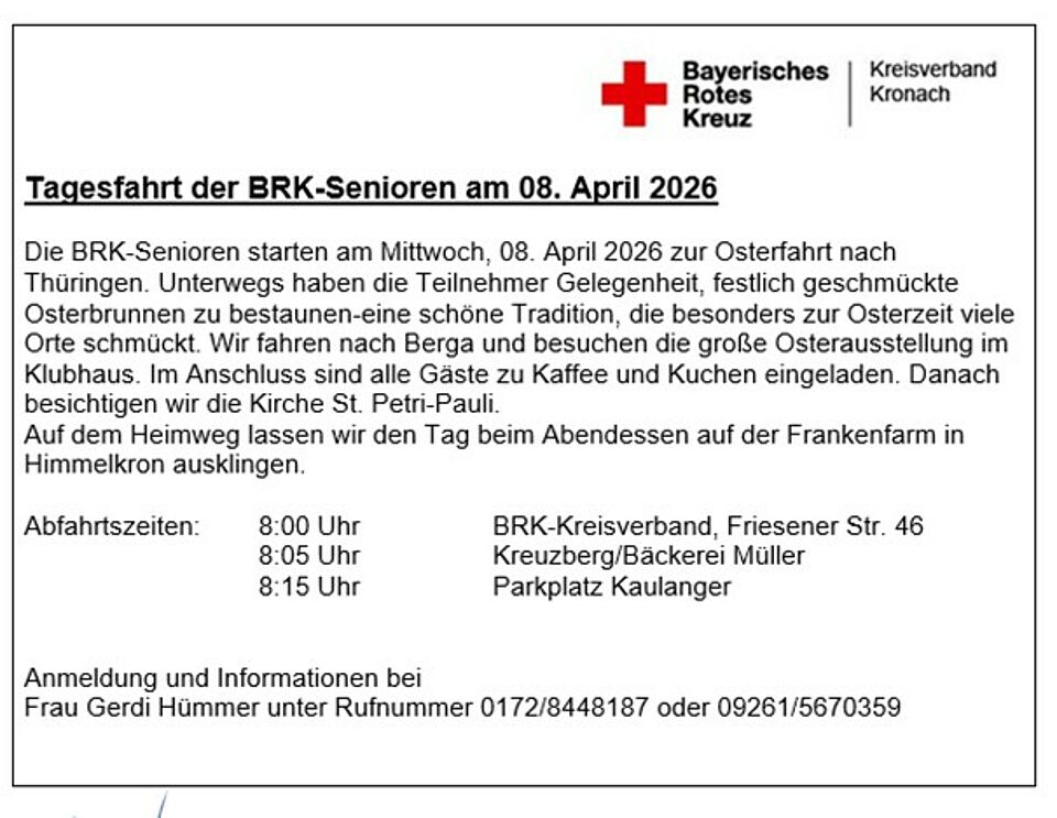 Am 08.04.2026 führen die BRK-Senioren eine Tagesfahrt durch, weitere Informationen entnehmen Sie dem Bild oben.